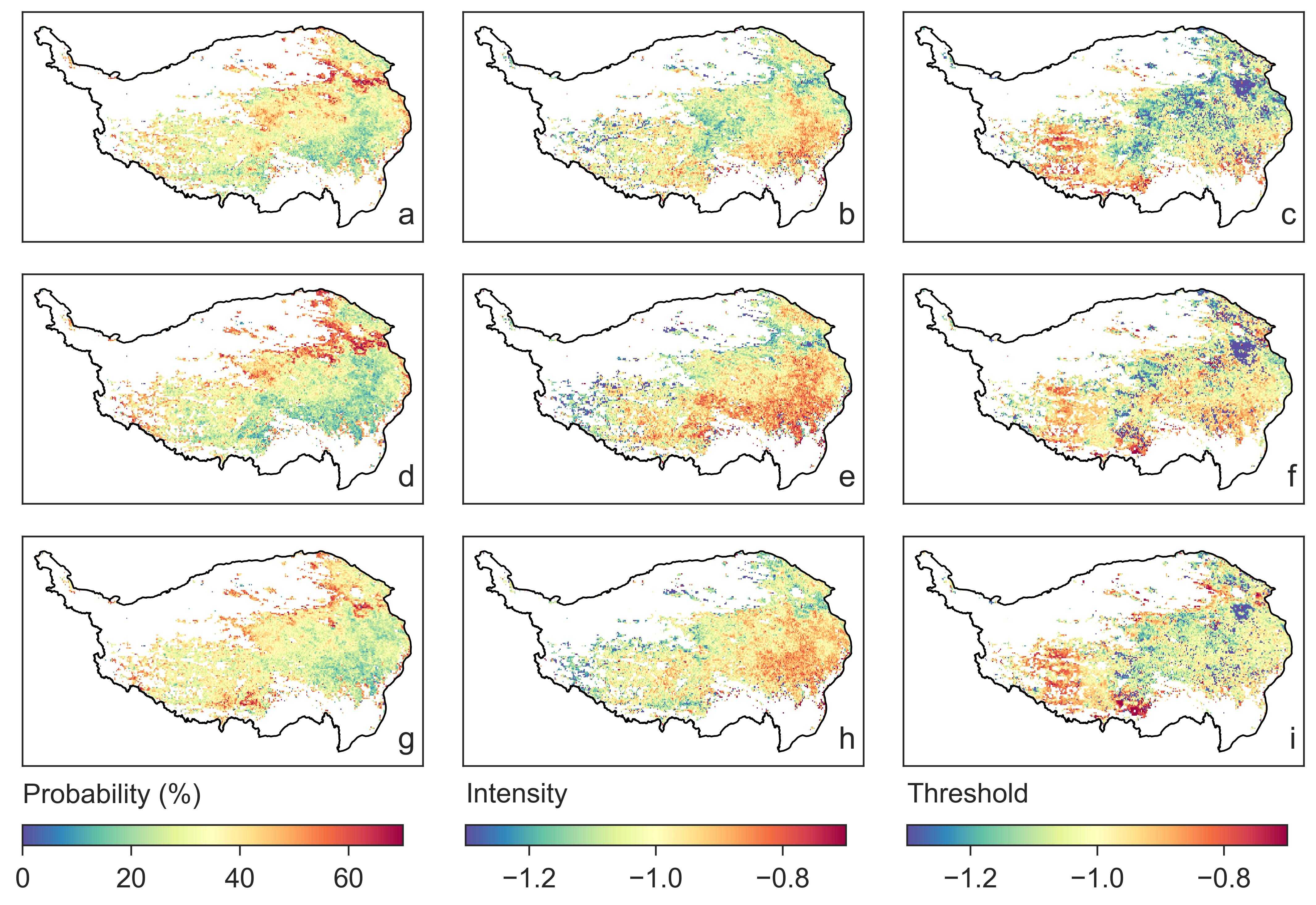 Spatial patterns drought impacts on net primary productivity (NPP) during the early (a–c), mid- (d–f), and late (g–i) growing-season stages across the Qinghai–Tibet Plateau grasslands (Image by ZHAO Wei)