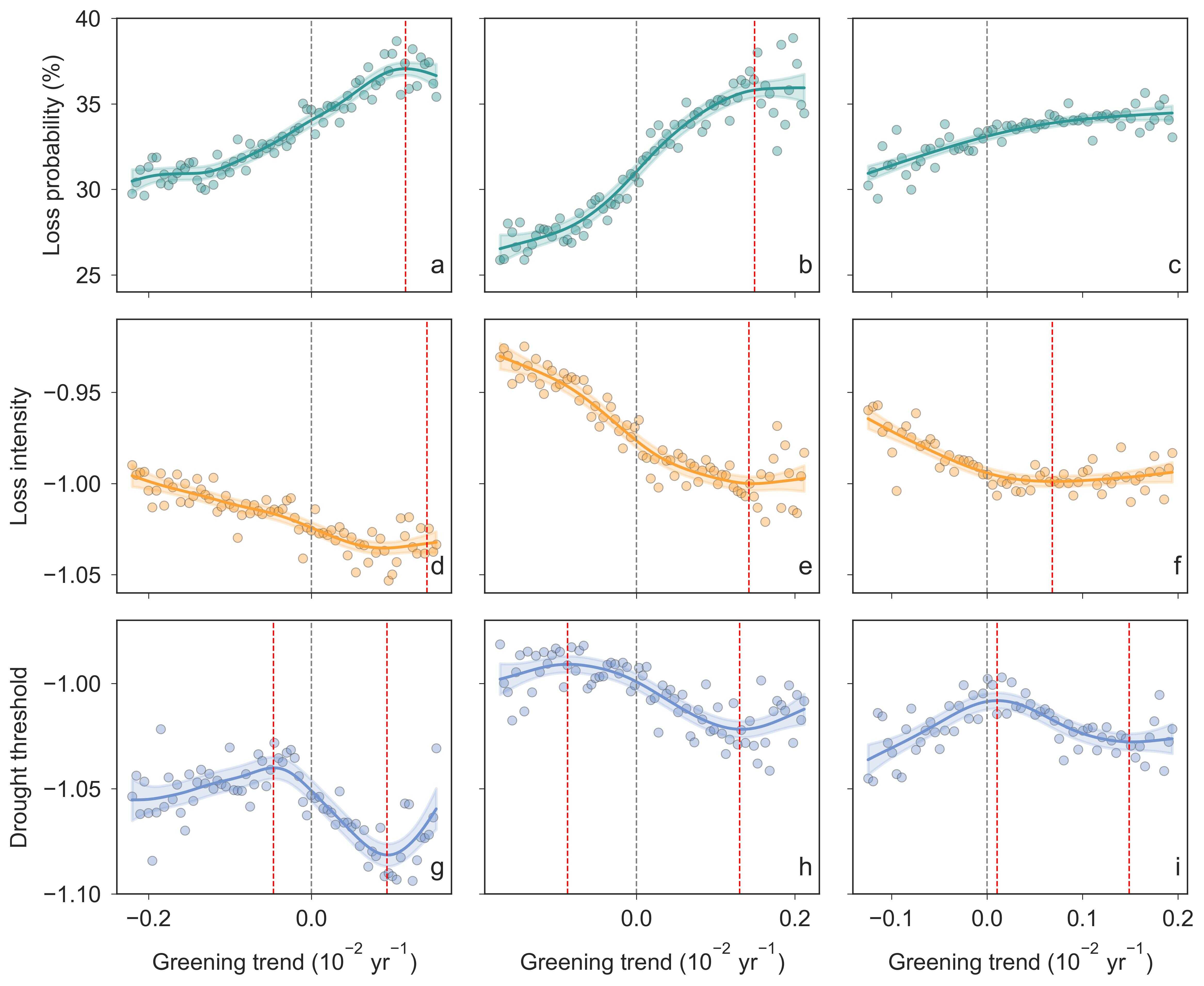 Relationships between greening trend and (a–c) drought loss probability, (d–f) mean loss intensity, and (g–i) the drought threshold for the early (a, d, g), mid- (b, e, h), and late (c, f, i) growing-season stages (Image by ZHAO Wei)